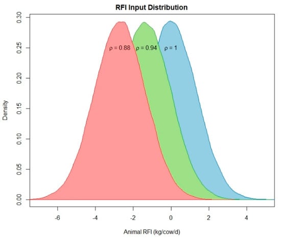 To illustrate how changes in the distribution of a herd’s RFI are expected to influence environmental outcomes, we simulated herds with 3 different distributions for ρ and compared the predicted outcomes with each other. We based our feed efficiency distributions on recent studies that measured and reported RFI [40]. Based on these studies, we set the standard deviation of the RFI distribution to 6% of the intake for all scenarios and set the mean RFI to 0, −1 SD, and −2 SD, so that the variability in feed efficiency is similar between scenarios but there is a mean shift increasing the mean population efficiency. The ρ distributions for each scenario are shown in Figure 3 and are designed to represent (1) a Baseline scenario in which the herd has an average RFI that is similar to present-day efficiency, (2) a High efficiency scenario in which the herd’s mean efficiency shifted to the 16 percentile of present-day efficiencies, and (3) a Very High efficiency scenario in which the herd’s mean efficiency shifted to the 2.5 percentile of present-day efficiency.