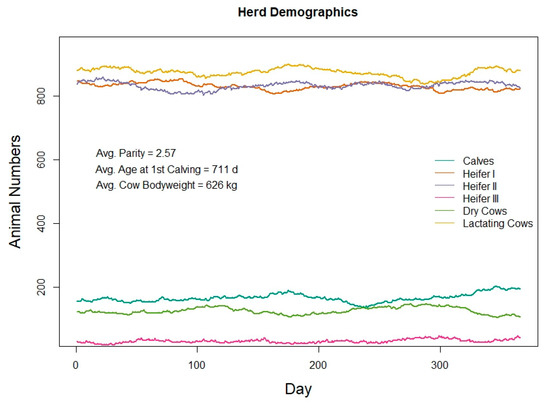 Herd demographics of a 1000-cow Holstein dairy herd simulated in the RuFaS model for 365 days.