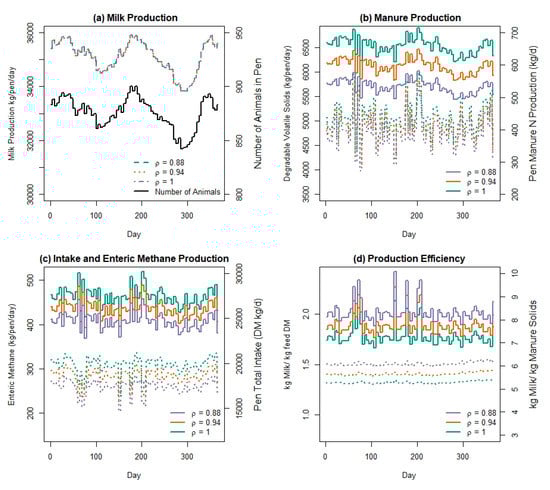 The expected impact of feed efficiency on herd production, intake, enteric methane, and manure production is shown in Figure 5. Figure 5a shows that each scenario achieved an equivalent milk production on every day of the simulation, as expected. Panel (a) also highlights oscillations in milk production throughout the year-long simulation, as the total number of lactating animals oscillates with individual animal reproduction and lactation events. We highlight some of the simulated manure characteristics in Figure 5b, and the impact of each feed efficiency scenario on manure outcomes is demonstrated. The total pen DMI shown in Figure 5c represents the daily sum of intake of a ration that is formulated at the user-defined ration interval of 3 days. The composition of the ration at each interval will vary in response to the varying nutrient requirements of the herd at the start of each ration formulation interval. The average and SD of the inclusion rate of each feed are the same for each scenario because the feed-efficiency parameter (ρ) was designed to create a distribution in intake responses to the same formulated ration. Thus, the ration formulation stays the same but the simulated feed consumed is altered.