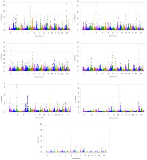Additive genetic variance explained by windows of 10 adjacent SNP distributed by chromosomes for (a) Scrotal circumference at 365 days of age (SC365), (b) Scrotal circumference at 450 days of age (SC450), (c) Gestation length (GL), as a calf trait, (d) Age at first calving (AFC), (e) Accumulated productivity (ACP), (f) Early calving until 30 months (HC30), and (g) Stayability (STAY).
