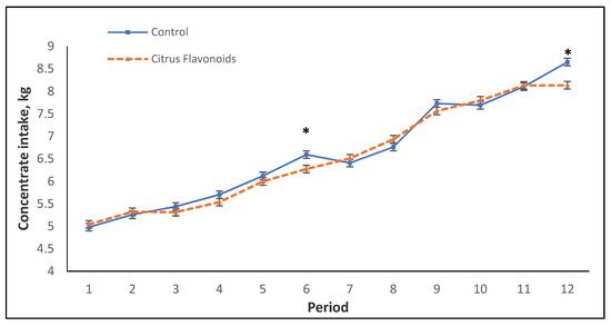 Mean of the concentrate intake during the growing and finishing phases of Holstein bulls fed high-concentrate diets with or without citrus flavonoids supplementation (* = p < 0.05).