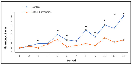 Flehmen every 15 min during the growing and finishing phase of Holstein bulls fed high-concentrate diets with or without citrus flavonoids supplementation (* = p < 0.05).