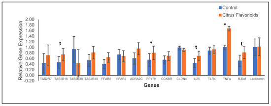 Gene expression in rumen epithelium of Holstein bulls fed high-concentrate diets with or without citrus flavonoids supplementation (* = p < 0.05 and t = 0.05 ≤ p ≤ 0.10). TAS2R7: Bitter taste receptor 7; TAS2R16: Bitter taste receptor 16; TAS2R38: Bitter taste receptor 38; TAS2R39: Bitter taste receptor 39; FFAR2: Free fatty acid receptor 3 (gpr41); FFAR3: Free fatty acid receptor 2 (gpr43); ADRA2C: Alpha 2-adrenergic receptors subtype C; PPYR1: Pancreatic polypeptide receptor 1; CCKBR: Cholecystokinin receptor 4; IL-25: Interleukin-25; TLR4: Pattern recognition receptors, like Toll-like receptor 4; TNFa: Tumor necrosis factor alpha; B-Def: Beta-defensin. The values presented herein correspond to back-transformed means; however, SEM corresponds to the ANOVA analyses using log-transformed data.