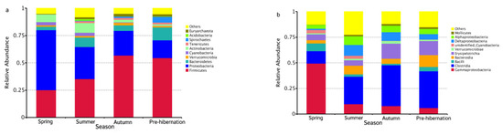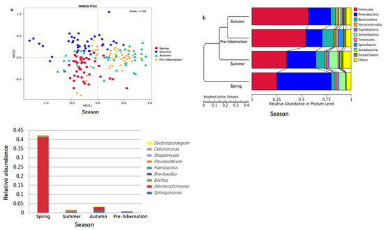 The seasonal relative abundance and distribution of bacteria may be indicative of seasonal variation in microbiota composition. Particularly, the composition of gut microbiota was seasonally changed (Figure 1a–f and Figure 3a,b). Differences were found in the specific bacteria among individuals (Table S5). The significant phylum and genera (p < 0.05) are listed in Tables S6 and S7, respectively. The abundance of chitin-digesting bacteria was found to be high in spring (Figure 3c).