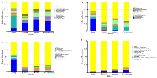 The relative abundance of bacterial compositions in different seasonal groups at different levels, phylum (a), class (b), order (c), family (d), genus (e), and species (f).