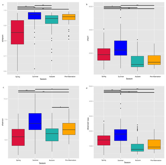 Comparison of alpha diversity of the gut microbiota in F. limnocharis at different seasons (Wilcoxon rank-sum test; p < 0.01 **; and p < 0.05 *). Simpson (a), Chao1 (b), Shannon (c) and observed taxa (d).