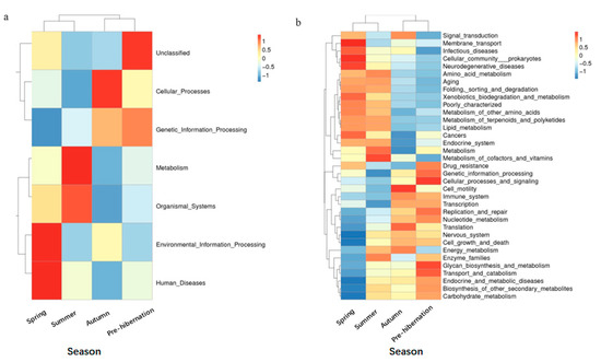 Functional predictions via Tax4Fun have suggested that the following three predicted functions dominated the four seasons: metabolism, genetic information processing, and environmental information processing (Figure S4). However, we found that most predicted functional categories in KEGG (Kyoto Encyclopedia of Genes and Genomes) pathways were significantly different among the four seasons, such as metabolism, environmental adaptation, and immune system (Figure 4a; t-test, p < 0.05; see Table S8). Particularly, metabolism (e.g., amino acid and lipid metabolism) and diseases (e.g., infectious diseases) were significantly higher in spring and summer than in autumn and pre-hibernation (Figure 4b; Table S8).