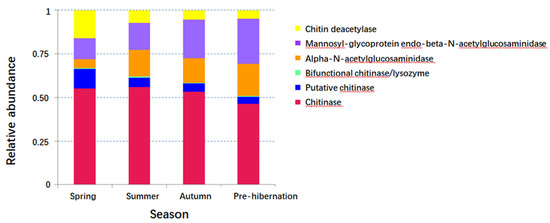 In order to further understand bacterial contribution to the specific environmental adaptability and diseases, we predicted that the gene function was linked to chitin-degrading ability, the biosynthesis of antibiotics, and antibiotic resistance among the four seasons. Analysis on potential chitin-degrading ability showed that the abundance of chitin-degrading enzymes, such as chitinase, β-N-acetylglucosaminidase, α-N-acetylglucosaminidase, chitin deacetylase, or putative chitinase, was significantly different among seasons (Kruskal-Wail test, p < 0.01) (Figure 5). Antibiotic genes were also significantly different between spring and summer (Mann-Whitney U test, p < 0.001), between spring and autumn (Mann-Whitney U test, p < 0.001), between spring and pre-hibernation (Mann-Whitney U test, p < 0.001), and between summer and pre-hibernation (Mann-Whitney U test, p = 0.001). In particular, the total abundance of all antibiotic genes was enriched in pre-hibernation as compared to other seasons (Wilcoxon rank-sum test, p < 0.01; Figure S5). Additionally, significant differences were also found in antibiotic resistance gene (beta-Lactam_resistance) between summer and autumn (Mann-Whitney U test, p < 0.001) and between summer and pre-hibernation (Mann-Whitney U test, p < 0.05).