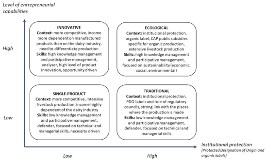 Based on the analysis presented in previous sections, we have identified four VCS within the value-added initiatives. This can be illustrated graphically via two dimensions related, on the one hand, to the type of context and, on the other, to the level of entrepreneurial skills of the farmers. Figure 1 graphically displays a matrix where the x-axis reflects the context as the level of institutional protection, while the y-axis shows the level of entrepreneurial capabilities.