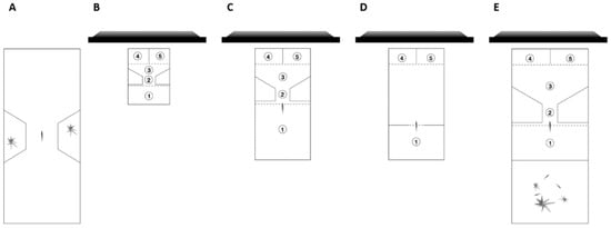 Aerial view of the (A) manual training apparatus and (B–E) the four versions of automated conditioning chambers used in this study. Each chamber was internally divided into a (1) starting area, a (2) a corridor, (3) V-shaped decision area, and (4,5) two choice areas. An LCD computer monitor projected the stimulus in each choice areas. (B) Automated conditioning chamber used in Experiment 1 and 5. (C) Automated conditioning chamber used in Experiment 2; the chamber was inserted into a larger tank (20 × 50 × 32 cm) provided with a gravel bottom, natural vegetation housing immature companions. (D) Automated conditioning chambers used in Experiment 3. (E) Automated conditioning chambers used in Experiment 4A and 4B.