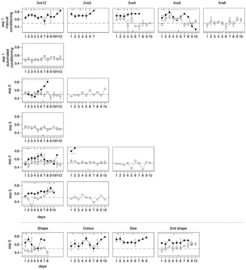 In Experiment 4A, six out of eight subjects achieved the 3 vs. 12 numerical discrimination according to the primary learning criterion (average number of trials: 291.00 ± 82.34; average number of days: 5.17 ± 1.47) and one additional subject reached the secondary learning criterion (Table 5). A subject did not achieve this discrimination after performing 597 trials. No subject achieved the 2 vs. 3 discrimination after performing on average 495.14 ± 135.10 trials.