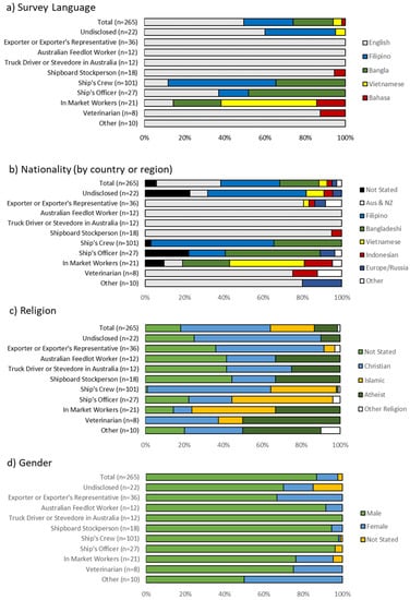 Of the 265 responses received, many were completed in English (49%), with the remainder in Filipino (25%), Bangla (20%), Vietnamese (4%), and Bahasa (2%) (Figure 1a). The predominant nationalities were Filipino (29.8%), Australian and New Zealander (32.8%) and Bangladeshi (20.0%) (Figure 1b). Filipino respondents either worked on ships (comprising 62.4% of the crew demographic and 18.5% of the ship’s officers) or did not disclose their industry role. Australian and New Zealand participants worked in all industry roles except for the ship’s crew or officers. The Bangladeshi workers contributed to 34.6% of the ship’s crew and 51.9% of the ship’s officers. The remaining Bangladeshi participants (13.5%) worked in-market. The Filipino respondents predominantly identified as Christian (97.5%) and Bangladeshi respondents as Muslim (98.1%). Australian respondents were predominantly Christian (44.0%) or atheist (25.3%), while 28.0% choose not to respond to this question (Figure 1c).