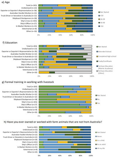 Most respondents had either completed high school (24.2%) or had higher education in the form of a trade certificate or tertiary degree (61.9%) (Figure 1f). Despite high levels of further education or training, very few respondents declared that they had received any formal training with livestock (22.3%) (Figure 1g). Besides veterinarians and shipboard stockpersons (whose roles require formal training), Australian feedlot workers were most likely to report formal training (66.6%). In comparison, 10.9% of ship’s crew and none of the ship’s officers reported having any formal training with livestock. This question had the highest non-response rate for the survey (n = 125).