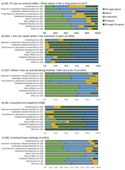 Few respondents from any group disagreed with the statement: When I see an animal being bullied, I feel sorry for it; however, there was a difference in the level of agreement between those in different industry roles. The majority of ship’s crew, ship’s officers, in-market workers, veterinarians, and those in ‘other’ positions strongly agreed with the statement. In contrast, truck drivers and stevedores in Australia, shipboard stockpersons, Australian feedlot workers, and the undisclosed group were more likely to select agree or undecided in response to the statement. Exporters and exporters’ representatives were evenly divided between agreed (47.2%) or strongly agree (47.2%) (Figure 2c).
