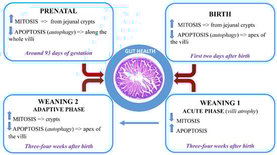 During the prenatal, neonatal, and weaning periods, the porcine gastrointestinal tract undergoes several morpho-functional, changes together with substantial modification of the microbial ecosystem. Modifications of the overall structure of the small intestine also occur, as well as a rapid increase of the volume, mainly in the last period of gestation: intestinal villi, starting from jejunum, appears shortly before the sixth week of gestation, and towards the end of the third month, epithelial cells diversify into enterocytes, goblet cells, endocrine, and Paneth cells. Moreover, in the neonatal period, colostrum induces an increase in intestinal weight, absorptive area, and brush border enzyme activities: intestine doubles its weight and increases the length by 30% within three days of birth. During weaning, intestinal environment modifies drastically due to a replacement of highly digestible sow milk by solid feed: profound changes in histological parameters and enzymatic activity are associated with the weaning period, such as the atrophy of the villi and consequent restorative hypertrophy of the crypts. All these modifications are the result of a delicate and precise balance between the proliferation and the death of the cells that form the intestinal mucosa (i.e., mitosis and apoptosis) and the health conditions of the piglet. An in-depth knowledge of these phenomena and of how they can interfere with the correct intestinal function can represent a valid support to predict strategies to improve gut health in the long-term and to prevent weaning gut alterations; thus, reducing antimicrobial use.