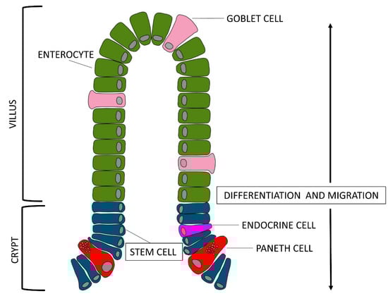 After stem cell mitosis, the fate of epithelial cells depends on the way they migrate: most of the cells go towards the apex of the villi and differentiate into enterocytes, mucous cells, or endocrine cells; some other cells migrate down the crypts and differentiate into Paneth cells (Figure 2). Enterocytes have a rapid turnover of about 48–72 h that alternates mitosis and apoptosis: the latter, a programmed physiological death, enables the removal of cells when these are old, damaged or mutated during different physiological stages, such as organogenesis, development, regeneration, and involution []. The dynamic balance between mitosis and apoptosis allows to maintain the correct physiology of the tissues and, if necessary, the rapid reconstruction of damaged tissues in case of pathologies [].