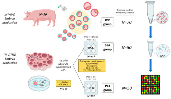 In this experiment, a total of 907 oocytes were matured and fertilized in vitro. The presumptive zygotes were cultured in NCSU-23 containing 0.3 mg/mL PVA and 100 ng/mL PF4 (defined medium; PF4 group; N = 469) or in NCSU-23 containing 0.4 mg/mL BSA (undefined medium; BSA group; N = 438) in a total of three replicates. Blastocysts obtained from each culture system were evaluated, and those classified as expanded were chosen for the microarray experiment (50 blastocysts for each in vitro group). In addition, a total of 70 in vivo-derived blastocysts classified at the same stage of development (IVV group) were also subjected to microarray analysis. The selected blastocysts were grouped into pools of 10 blastocysts, performing one array for each embryo pool, thus resulting in five microarrays for the PF4 group, another five for the BSA group and seven for the IVV group. Figure 1 schematically represents the experimental design conducted.