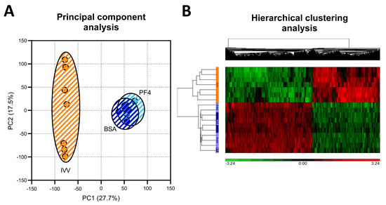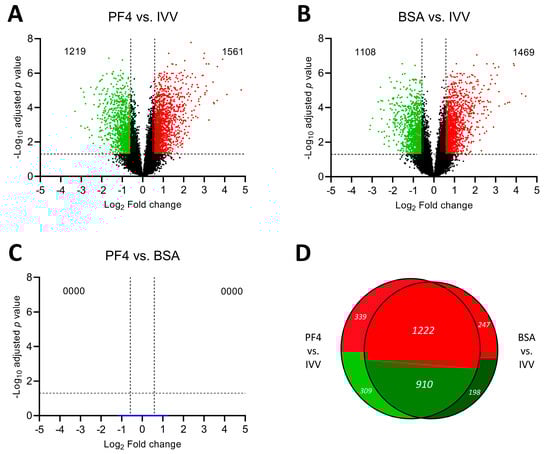 The expression of the total set of transcripts analyzed is represented in volcano plots for each pairwise comparison made between the three experimental groups (Figure 3). When the PF4 group was compared to the IVV group, a total of 2780 DEG were determined (PF4 list), of which 1219 were downregulated while 1561 were upregulated (Figure 3A). On the other hand, when the groups compared were the BSA group versus the IVV group, a total of 2577 DEG were obtained (BSA list), among which 1108 were downregulated and 1469 were upregulated (Figure 3B). Then, the cross-analysis of the two lists revealed they shared 2132 DEG. These differences are graphically represented by a Venn diagram in Figure 3D. Finally, the comparison between the two in vitro groups (PF4 versus BSA), did not show any DEG (Figure 3C).