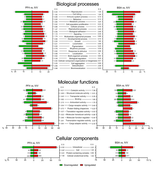 Classification of differentially expressed genes (DEG) organized by gene ontology (GO)-terms. The lists of DEG were obtained after comparing the in vitro embryos cultured in defined media (PF4: platelet factor 4) versus the in vivo-derived embryos (IVV), and the in vitro embryos cultured in undefined media (BSA: bovine serum albumin) versus the IVV embryos. In each forest plot, the X-axis represents the percentage of DEG out of the total number of genes belonging to each category. Green bars represent the percentages of downregulated DEG, while the red bars indicate the percentages of upregulated DEG. Next to each bar, the number of upregulated (red bar) or downregulated (green bar) DEG, belonging to that GO-term is indicated. ES: enrichment score.
