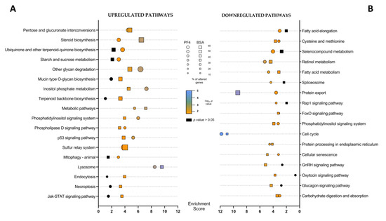 Representation of the different pathways considered altered (p value < 0.05) obtained from the (A) upregulated differentially expressed genes (upregulated pathways) and from (B) the downregulated differentially expressed genes (downregulated pathways). The enrichment values for each pathway are indicated by a circle in the case of the comparison between in vitro embryos cultured in defined medium (PF4: platelet factor 4) and in vivo-derived embryos (IVV) and by a square in the case of the comparison between in vitro embryos cultured in undefined medium (BSA: bovine serum albumin) and IVV embryos. The size of the symbol indicates the percentage of affected genes out of the total number of genes belonging to that pathway. The color of the symbol indicates the p-value of each pathway.
