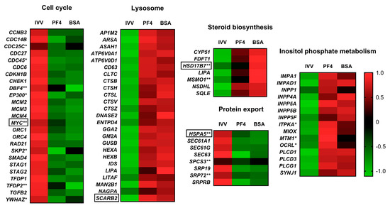 Of the different affected pathways, those that presented a higher enrichment score in both lists were the lysosome pathway (enrichment scores of 8.5 and 9.6, respectively) for upregulated DEG and the cell cycle pathway (enrichment score of 11.8 and 11.0 respectively), for downregulated DEG. In addition, some altered pathways showed higher enrichment scores and percentages of DEG in the BSA-list than in the PF4-list, such as the protein export and steroid biosynthesis pathways (Figure 5 and Supplementary Tables S1 and S2). In contrast, the inositol phosphate metabolism was more affected in PF4 than in the BSA list (Figure 5A and Table S1). The intensity of DEG expression belonging to the most representative altered pathways is shown in different heat maps in Figure 6.