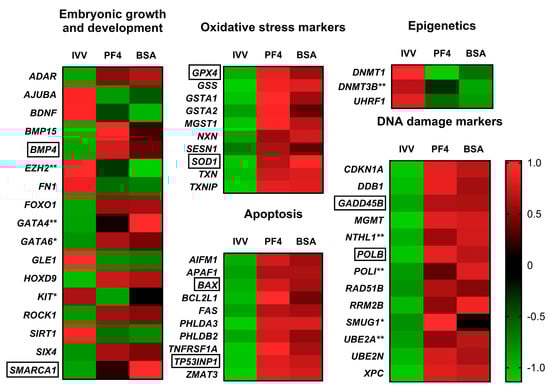 Heat maps grouping differentially expressed genes by specific functions at the embryonic level or as markers of damage for the three experimental groups: in vivo-derived embryos (IVV), in vitro embryos cultured in defined medium (PF4) and in vitro embryos cultured in undefined medium (BSA). * Indicates a gene considered differentially expressed in the case of the PF4 (PF4: platelet factor 4) versus IVV comparison but not in the BSA (BSA: bovine serum albumin). versus IVV comparison. ** Indicates a gene considered as differentially expressed in the BSA versus IVV comparison but not in the PF4 versus IVV comparison. Genes without any symbol indicate that they were considered differentially expressed in both comparisons. Genes surrounded by a box were selected for validation by q-PCR.