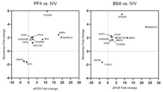 Another group of genes that were significantly altered in both PF4 and BSA embryos compared to in vivo-derived were related to oxidative stress. As has already been highlighted in several previously published articles, IVC conditions dramatically aggravate the stress suffered by embryos [65,66]. This situation is reflected in this study where different genes related to oxidative stress were upregulated in IVP embryos, including essential genes involved in the protection of cells against free radicals such as GSS, GPX4, GSTA, MGST1 [67], TXN, TXNIP, NXN [68], SOD1 [69] and SESN1 [70]. One of the main consequences of this overexposure to different types of free radicals is the damage that they cause to DNA [71], which has been confirmed in both oocytes [72] and embryos [73,74,75]. In that sense, in this study, we observed how, independent of the culture type, IVP embryos overexpressed genes involved in DNA repair processes. Of this group of genes, the one that showed the greatest differences with respect to the IVV was MGMT, depicting fold change values above 8 in both the BSA and PF4 groups. This gene encodes for a protein responsible for accepting alkyl groups from damaged nucleotides and reestablishing their functionality [76], which has been demonstrated as a typical injury triggered by oxidative damage [77]. Other interesting genes involved in DNA repair were GADD45B [78], DDB1 [79] and POLB, which repair short patch base excisions [80]. Although DNA repair is a physiological mechanism necessary for the process of embryonic development and to avoid cell arrest [81], the differences observed in IVP embryos indicate damage at this level, probably induced by this increased oxidative stress. If the cell is unable to repair DNA lesions, then apoptotic pathways could be activated to eliminate damaged cells [82]. In the present study, overexpression of certain genes related to this process was observed. Of these proapoptotic altered genes, the TP53INP1 stands out and presents fold change values higher than five in PF4 and BSA embryos. This proapoptotic gene, induces apoptosis and cell cycle arrest in cells subjected to different types of stress, including oxidative stress agents [83,84]. Other genes related to the apoptotic process were also overexpressed such as FAS, which has been widely used as an indicator of apoptosis in blastocysts of various species [85,86,87], AIFM1, a mitochondrial effector of apoptotic cell death [88] and BAX, whose expression levels would influence oocyte and embryo survival [89].