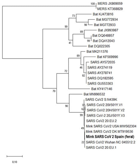 - ProMED-Mail. Coronavirus Disease 2019 Update (319): Spain (Aragon) Animal, Farmed Mink, First Report. 2020. Available online: https://promedmail.org/promed-posts/?id=7584560 (accessed on 24 April 2021).