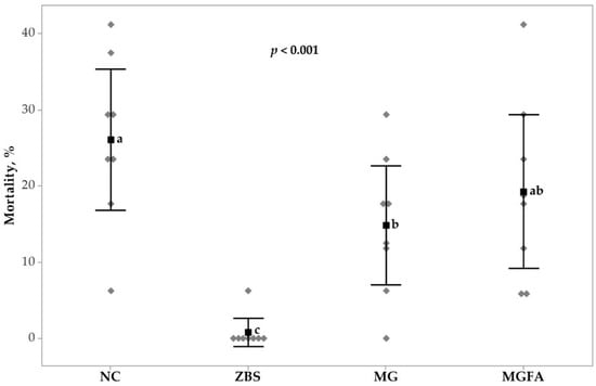 Necrotic enteritis (NE) caused mortality of broilers in response to additive treatments from d 14 to 17. All birds were gavaged with Eimeria spp. on day 9 and C. perfringens on day 14. NC, non-additive control; ZBS, zinc bacitracin and salinomycin; MG, monoglyceride blend; MGFA, MG in starter phase and buffered formic acid (FA) in grower and finisher phases. a–c values in a row with no common superscripts differ significantly (p < 0.05).