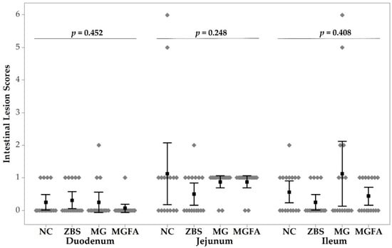 Non- parametric Kruskal–Wallis test indicated no significant differences of duodenal, jejunal, and ileal lesions in different treatment groups (p = 0.452, 0.248, and 0.408, respectively). Neither birds treated with ZBS nor feed additives (MG and MG+FA) used had any significant effects on intestinal lesions compared to the NC group. Moreover, there were no NE-caused intestinal lesions observed in any of the treatment groups on day 24.