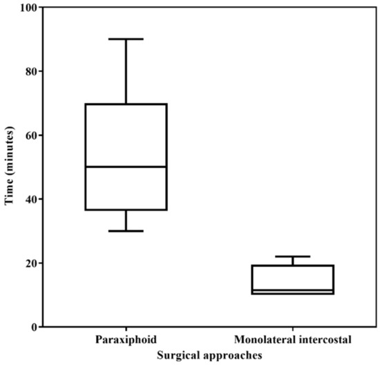 Comparison of the surgery time between two thoracoscopic pericardial techniques (paraxifoid approach vs. monolateral intercostal approach). Box-plot depicts time’s minimum and maximum (whiskers) and medians (line across the box).