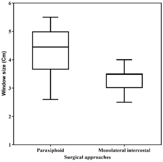 The paraxiphoid approach resulted in a significantly larger window size (mean diameter 4.23 ± 0.80 (SD) cm) compared to monolateral intercostal technique (mean diameter 3.31 ± 0.43 (SD) cm) (p < 0.0001) (Figure 2).