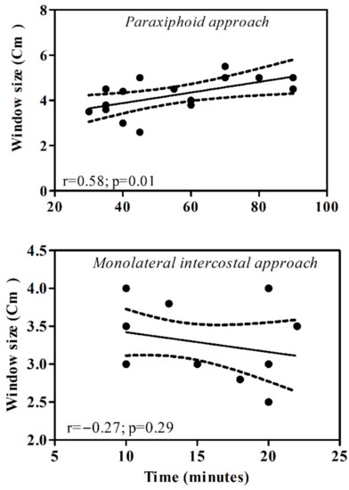 Scatter plot of the surgery time vs. pericardial window size in each surgical treatment. The distribution data showed a linear regression for the paraxiphoid approach.