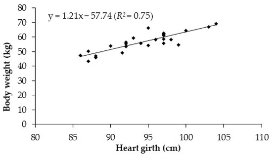 Heart girth ranged from 86 to 104 cm, with a mean of 94 cm (Table 1). Among all somatic measurements, only HG had regression coefficients significantly different from zero (p < 0.05) in all fat depots analyzed. The relationship between HG and BW showed a mean HG change of 1.2 cm per unit (kg) of BW (BW = 1.2 HG − 57.7; R2 = 0.75; Figure 1).