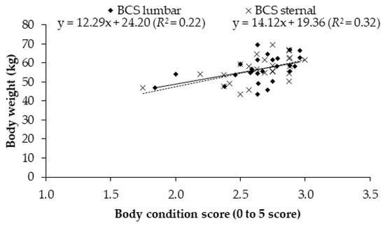 Relationship between lumbar or sternal body condition score (BCS, scale 0–5) and body weight in lactating Saanen goats.