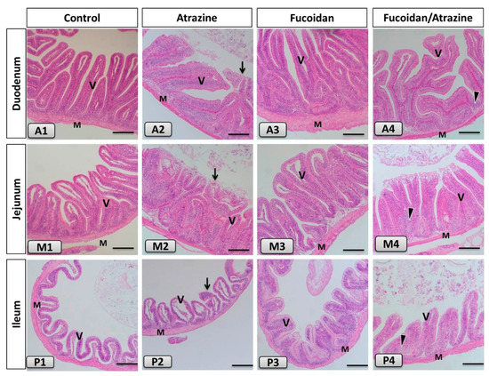 Histomicrograph of the Nile tilapia intestine of including duodenum (upper panel; A1–A4), jejunum (middle panel; M1–M4) and ileum (lower panel; P1–P4) in the control group as well as other treated (Atrazine, Fucoidan, and Fucoidan/Atrazine) groups. The histological organization in the control group as well as the Fucoidan-treated groups showed normal, intact intestinal villi (V), lamina propria sub mucosa, tunica muscularis (M) and tunica serosa with enriched growth of the intestinal villi in the Fucoidan-treated group. The intestine of atrazine-treated fish revealed destruction and inflammatory cell infiltration in the intestinal mucosa with desquamation of the lining epithelium (black arrow). The Fucoidan/Atrazine-subjected group presented apparent improvement of the intestinal villi in addition to immune cell infiltration near the base of the intestinal villi (arrowhead). Stain H&E. Bar: 100 µm.