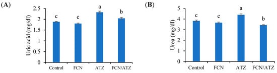 The uric acid and urea levels were meaningfully higher in Nile tilapia intoxicated with ATZ with or without fucoidan than fish without ATZ toxicity (Figure 2A,B). Levels of uric acid and urea tended to decrease by fucoidan in groups of fish exposed to AZT compared with fish fed the basal diet (p < 0.05). The creatinine and bilirubin levels exhibited marked higher values in ATZ-exposed fish and lower values in fucoidan fed fish (p < 0.05), while fish exposed to ATZ and fed fucoidan had similar creatinine and bilirubin levels with regard to the control (p ˃ 0.05) (Figure 2C,D). The blood total protein and albumin had higher levels in fucoidan-fed fish and lower values in ATZ-exposed fish, while fish exposed to ATZ and fed fucoidan had similar total protein and albumin levels with regard to the control (p ˃ 0.05) (Figure 2E,F). The globulin level was obviously reduced by ATZ toxicity (p < 0.05) compared with fish fed the basal and fucoidan diets without ATZ toxicity (Figure 2G). The levels of triglycerides and total cholesterol were significantly reduced by ATZ toxicity (p < 0.05) compared with fish fed the basal and fucoidan diets without ATZ toxicity (Figure 2H,I). Meanwhile, fish fed fucoidan and exposed to ATZ had lower values than fish exposed to ATZ without fucoidan feeding (p < 0.05).