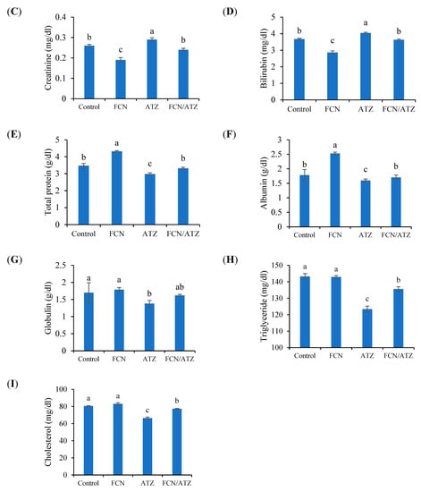 The blood biochemical traits of Nile tilapia fed fucoidan and exposed to atrazine. Bars present means ± S.E. with different letters; differ significantly (p < 0.05). The groups are the control, fish fed dietary fucoidan (FCN), fish fed basal diet and exposed to atrazine (ATZ), and fish fed FCN and exposed to ATZ (FCN/ATZ). Blood uric acid (A), urea (B), creatinine (C), bilirubin (D), total protein (E), albumin (F), globulin (G), triglycerides (H), and cholesterol (I).