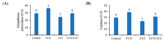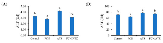 The activities of liver enzymes (ALT and AST) were higher in ATZ-exposed fish and lower values in fucoidan fed fish (p < 0.05), while fish exposed to ATZ and fed fucoidan had similar values of ALT and AST with regard to the control (p ˃ 0.05) (Figure 3A,B).