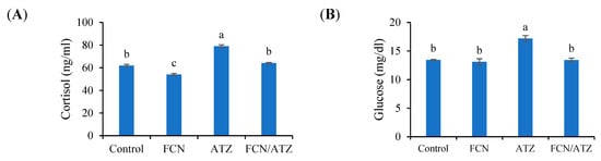 The cortisol level manifested higher values in ATZ-exposed fish and lower values in fucoidan fed fish (p < 0.05), while fish exposed to ATZ and fed fucoidan had similar cortisol levels with regard to the control (p ˃ 0.05) (Figure 4A). Besides, the glucose level showed a higher value in the ATZ-exposed group than the other groups (p < 0.05) (Figure 4B).