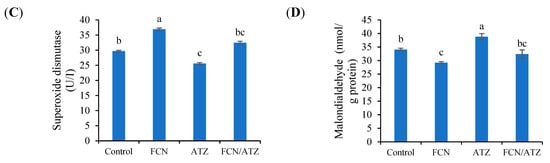 The blood antioxidative traits of Nile tilapia fed fucoidan and exposed to atrazine. Bars present means ± S.E. with different letters; differ significantly (p < 0.05). The groups are the control, fish fed dietary fucoidan (FCN), fish fed basal diet and exposed to atrazine (ATZ), and fish fed FCN and exposed to ATZ (FCN/ATZ). Glutathione peroxidase (A), catalase (B), superoxide dismutase (C), and malondialdehyde (D).