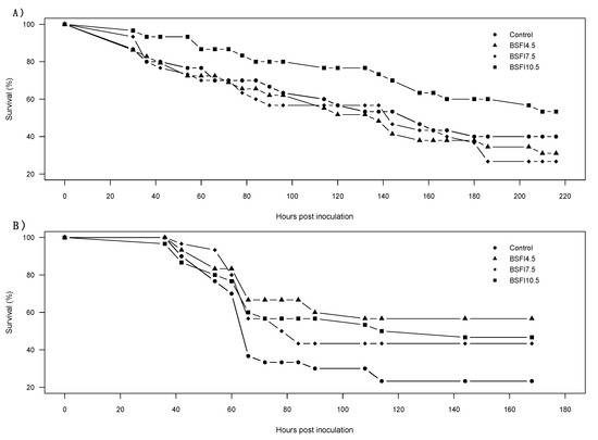 Survival curves of the acute hepatopancreatic necrosis disease (AHPND) (A) and white spot syndrome virus (WSSV) (B) disease challenge trials of Litopenaeus vannamei fed the four experimental diets (Control, and experimental diets with 4.5, 7.5 and 10.5% functional ingredient derived from H. illucens (BSFI), respectively BSFI4.5, BSFI7.5, and BSFI10.5). Survival curves were statistically similar among dietary treatments (AHPND p = 0.15, WSSV p = 0.07).