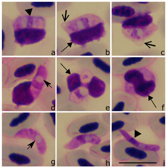 Lankesterella kabeeni sporozoites escaped from host cells very rapidly. Within 1 min after the EBA, sporozoites were seen at the stage of initiation of escape from infected cells (Figure 6d), but the majority were still intracellular (Figure 6a–c). At this stage of development, a slight deformation of the host cell envelope was visible (Figure 6b–c); this feature was not observed in blood films prepared using fresh blood, which was not exposed to air (compare Figure 1, Figure 2, Figure 3 and Figure 4 with Figure 6b–c) thus, the host cell envelope changes were certainly induced by escaping sporozoites. Within 3 min after EBA, free sporozoites were more frequently seen, and the parasites deforming the host cells and their nuclei were numerous (Figure 6e–f). The number of extracellular sporozoites gradually increased, and intracellular parasites were extremely rare 1 h after EBA, and they were not observed 2 h and later after EBA. It is worth noting that two different forms of sporozoites were seen. First, the broad-width forms possessing nuclei with relatively low chromatin condensation (Figure 6g,h). Second, narrow-width forms possessing nuclei with a highly condensed chromatin (Figure 6i). The presence of these two different sporozoite forms was not related to the time passed after the EBA; they were usually seen simultaneously.