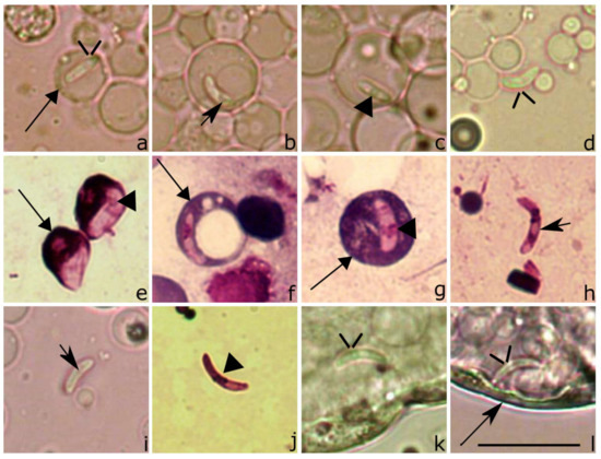 Sporozoites of Lankesterella kabeeni 18S rRNA lineages LanAcro1 (a,b,d) and LanAcro8 (c,e–l) in experimentally infected Aedes aegypti after blood meal on the naturally infected sedge warblers Acrocephalus schoenobaenus. The images show sporozoites in wet preparation (a–d,i,k,l) and methanol-fixed and Giemsa-stained preparation (e–h,j). Sporozoites inside mosquito haemocytes (a–c,e–g); they were also seen located free after the midgut was crashed (d,h–j) and inside mosquito midgut (k,l). Triangle, parasite nucleus. Short, barbed arrow, vacuole-like structure. Simple wide arrowheads, sporozoites. Long barbed arrow, basal lamina. Long triangle arrow, haemocytes. Scale bar: 10 µm.