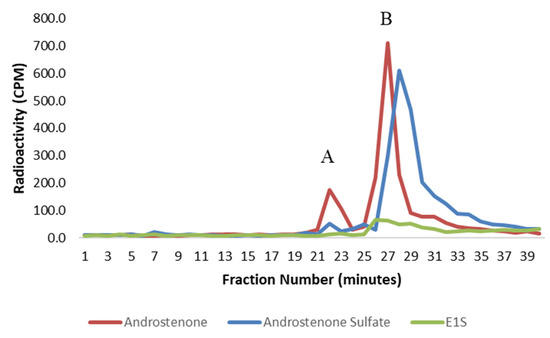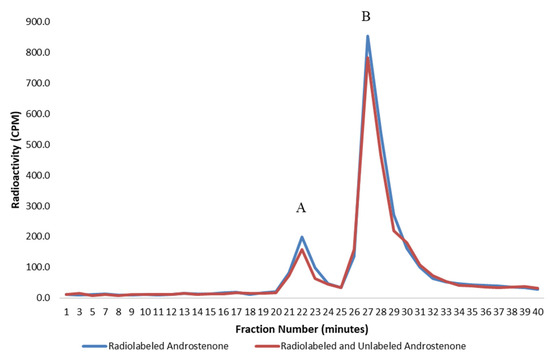 Affinity chromatography was used to isolate albumin from pooled porcine plasma, which enabled the direct binding of radiolabeled steroids to porcine albumin to be quantified. Affinity chromatography was conducted using a HiTrap Blue HP albumin-specific affinity chromatography column purchased from GE Healthcare (Mississauga, ON, Canada), as previously described by Bone et al. [7]. Briefly, Plasma was diluted to 20 mg/mL in a 20 mM sodium phosphate binding buffer (pH 7.0) and applied to the column. The albumin fraction was eluted from the column using a 20 mM sodium phosphate and a 2 M NaCl (pH 7.0) elution buffer and was subsequently applied to a PD-10 desalting column purchased from GE Healthcare (Mississauga, ON, Canada) and eluted with Millipore water. Desalted albumin fractions were reconstituted in PBS buffer after freeze drying, and the concentration of albumin isolated from the plasma was determined using the Bradford assay [15]. The isolated albumin (200 µL, 10 mg/mL) was incubated with radiolabeled steroid solutions of androstenone, androstenone sulfate, or E1S (200 µL, 0.028 µCi) and analyzed by HPLC gel filtration to evaluate direct steroid binding. All incubations were run in duplicate.