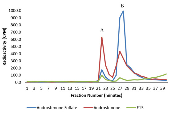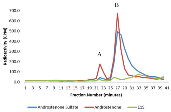 A graph showing the binding of androstenone sulfate (blue), free androstenone (red), and E1S (green) in porcine plasma following HPLC gel filtration. Bound and unbound steroid peaks are represented by A and B, respectively. Values are expressed as the mean from three separate experiments.