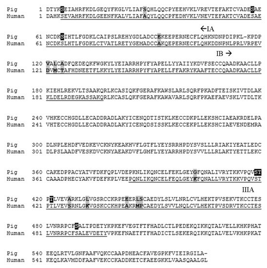 The amino acid sequence of human and porcine albumin [24,25]. Amino acids comprising the IA, IB, and IIIA binding domains of human serum albumin and the corresponding amino acids in pigs are underlined. Key amino acid differences are highlighted in grey, and phosphorylation sites are highlighted in black. Signal sequences have been excluded from the figure.