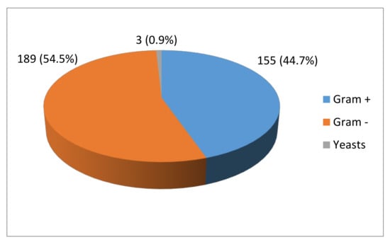 Microorganisms were isolated from 323 out of the 363 mares (89.0%) included in the study. A total of 347 isolates were obtained from the 323 positive mares. Yeasts were identified in three isolates. Gram-positive and -negative bacteria were observed in 155 and 189 isolates, respectively (Figure 1).