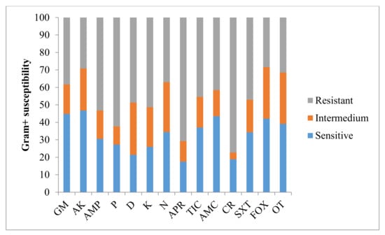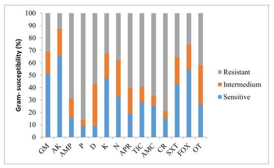 Regarding Gram– microorganisms, they showed the highest sensitivity to gentamicin (51.1%) and amikacin (65.8%). However, Gram– bacteria were resistant to most of the tested antibiotics. Thus, they showed to be resistant to doxycycline (57.4%), ticarcillin (59.5%), apramycin (60.0%), amoxicillin/clavulanic acid (66.3%), ampicillin (68.9%), cephaloridine (78.9%) and penicillin (85.8%) (Figure 3).