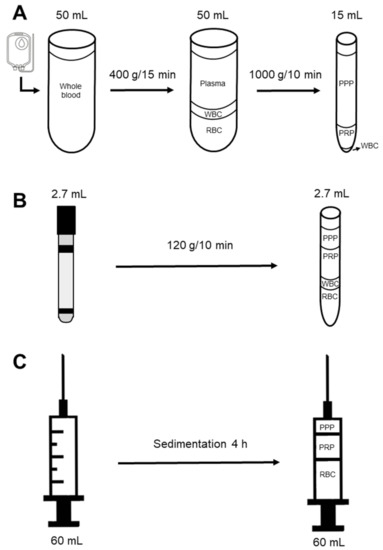 Diagram of three methods to prepare platelet-rich plasma (PRP) for intrauterine infusions in mares. (A) Method 1, blood was collected in a 150 mL blood transfusion bag and processed by 2-step centrifugation; (B) Method 2, blood was collected in 2.7 mL vacutainer tubes and processed by one-step centrifugation; (C) Method 3, blood was collected in a 60 mL syringe and PRP produced by sedimentation. Abbreviations: PPP, platelet-poor plasma; WBC, white blood cells; RBC, red blood cells.